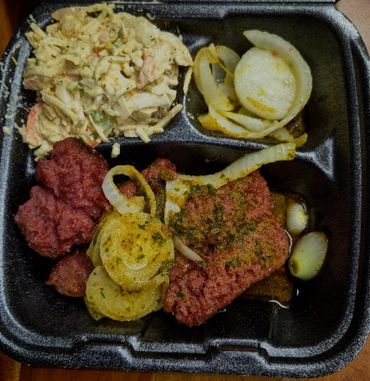 shredded steak with white onion, red bell pepper, tomatoes, jalapenos and mayo
